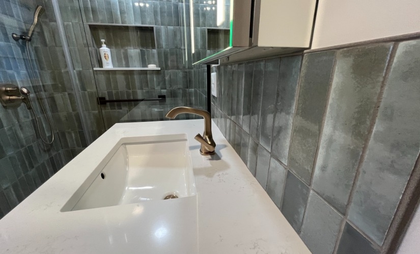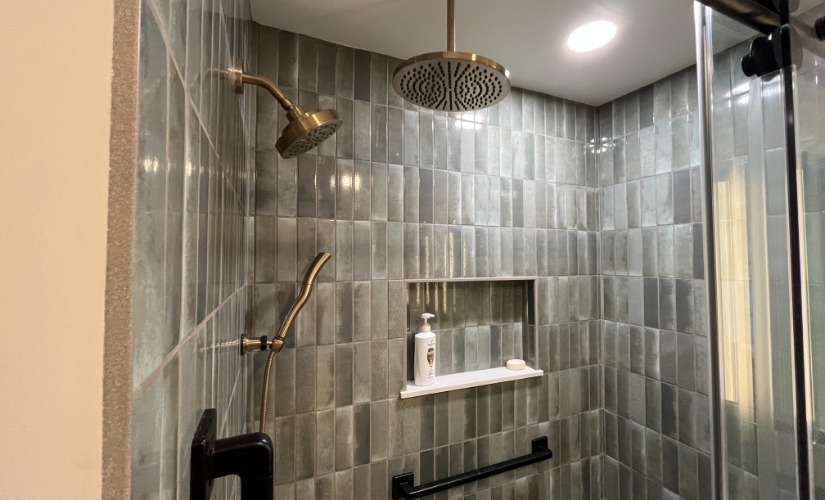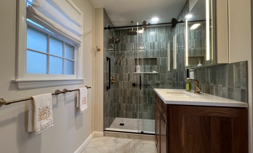 This bathroom was transformed from a dated, hard-to-maintain space into a true personal oasis. We removed the old tile and tub/shower combo to make way for a spacious, walk-in luxury shower packed with elevated features. The shower is the star of the design, complete with both an overhead rain shower and a versatile handheld showerhead, offering a spa-like experience at home. Warm, natural walnut cabinetry adds a rich, calming touch, beautifully complemented by herringbone-patterned marble-look tile that guides you right into your dream shower. A soft green tile on the shower walls subtly brings in a natural, serene vibe without overwhelming the space with color. We also incorporated heated floors for cozy comfort during Michigan’s cold winter months. The thoughtful mix of matte black and champagne bronze fixtures brings a sophisticated edge and a sense of understated luxury to the room.