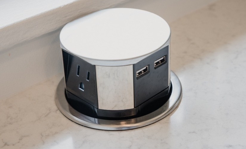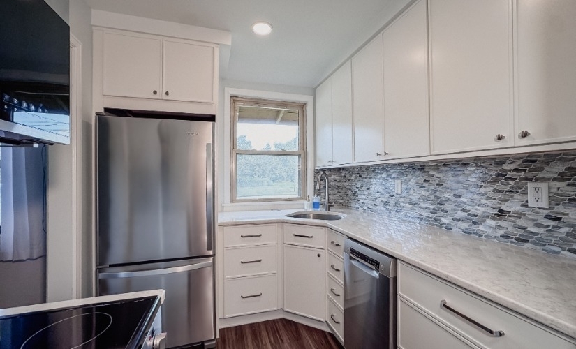 In Ann Arbor’s historic Pittsfield Village neighborhood, Marsha transformed our client’s small, outdated 8' x 7'6" kitchen into a highly functional and personalized space—all without altering the original footprint. By relocating the sink to the corner, we created enough room for an apartment-sized dishwasher and added much-needed drawer storage. We upgraded the gas range to a sleek induction range and gave it a more built-in appearance with a custom panel and extended countertop—improving both aesthetics and safety for little ones on the move. The new wood-look LVP flooring, fresh wall paint, and refreshed built-in pantry modernize the space while respecting its 1940s-era charm. To meet local code requirements, which call for outlets every 24 to 48 inches in updated kitchens, we installed a pop-up power outlet just below the window—an elegant solution where a traditional wall outlet wasn't possible due to the low window height. To maximize every inch of their 700 sq.ft. condo, Marsha even carved out additional storage above the stairwell, making this small kitchen feel smart, spacious, and uniquely theirs. To bring the design to life, we chose materials that were as functional as they were meaningful. Showplace’s sleek, modern Aspen door style in a warm, inviting shade of white brightens the room while offering timeless appeal. The glass tile backsplash from Lunada Bay Tile adds soft shimmer and gentle movement, thoughtfully chosen to echo the clients’ shared chapter living aboard a sailboat. For the floors, we selected a durable, low-maintenance wood-look LVP from Shaw Flooring—perfect for everyday living in a compact home. Contemporary hardware from Hardware Resources ties the whole design together with clean lines and practical elegance, making this petite kitchen feel both elevated and deeply personal.